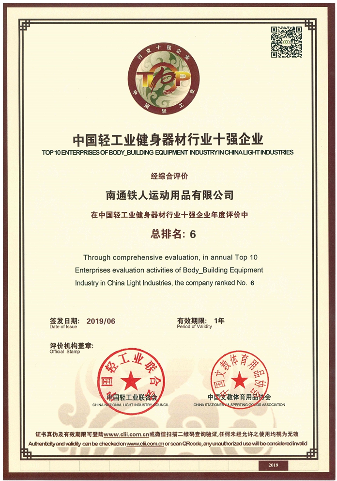 | 2019 | 2019中國輕工業(yè)健身器材行業(yè)十強(qiáng)企業(yè) | 中國輕工業(yè)聯(lián)合會、中國文教體育用品協(xié)會 |